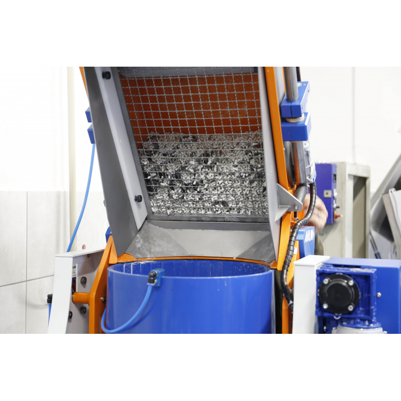 Odstredivé omielacie zariadenie s automatickým separátorom. Telieska po separácii pomocou motora sa vracajú do nádoby naspäť.