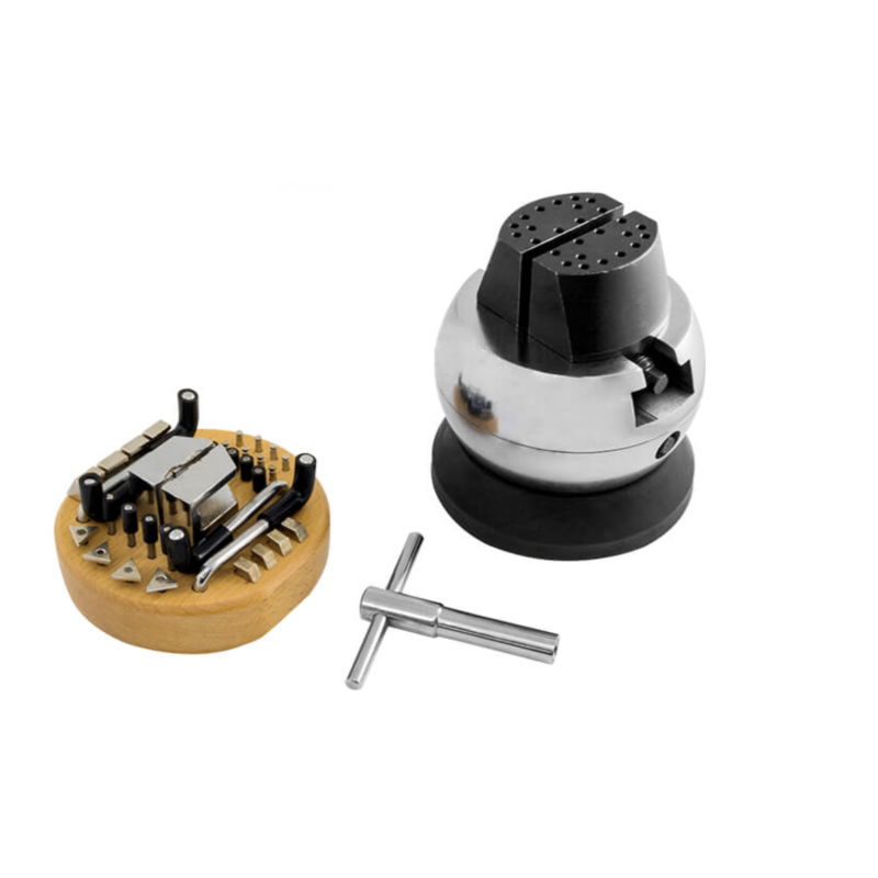 Gravírovacia guľa s lakovaným, matným povrchom, horná časť s nastaviteľnou brzdou, centrálne nastaviteľné čeľuste s hranolom na vertikálne upnutie okrúhlych obrobkov a s otvormi pre ďalšie nástroje, samostrediace nadstavce čeľustí a rozsiahle príslušenstvo.