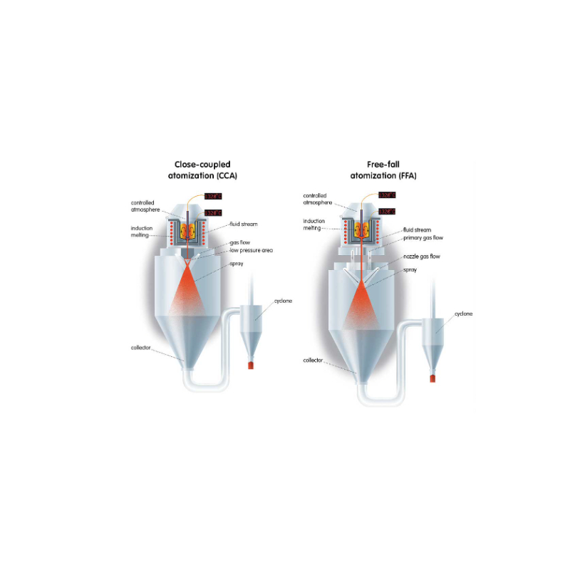 Modulárna dostupnosť voľného pádu, ako aj tesne spojené atomizačné dýzy na získanie špecifických vlastností kovového prášku. Rýchla a jednoduchá výmena trysky.