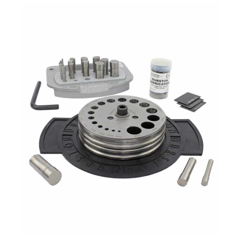 Inovatívne a ľahko použiteľné riešenie uzamykania umožňuje uzamknúť a potom vybrať imbusový kľúč (tiež je súčasťou súpravy kotúčovej rezačky). Súprava obsahuje aj nivelačné podložky, ktoré poskytujú kompletné riešenie pre kotúčovú rezačku pre vašu klenotnícku dielňu. Súprava obsahuje 17 razníkov s veľkosťou od 3 mm do 19 mm a hmotnosťou 7,45 kg (3, 4, 5, 6, 7, 8, 9, 10, 11, 12, 13, 14, 15, 16, 17, 18, 19 mm). Na rezanie neželezných kovov s hrúbkou do 1 mm.